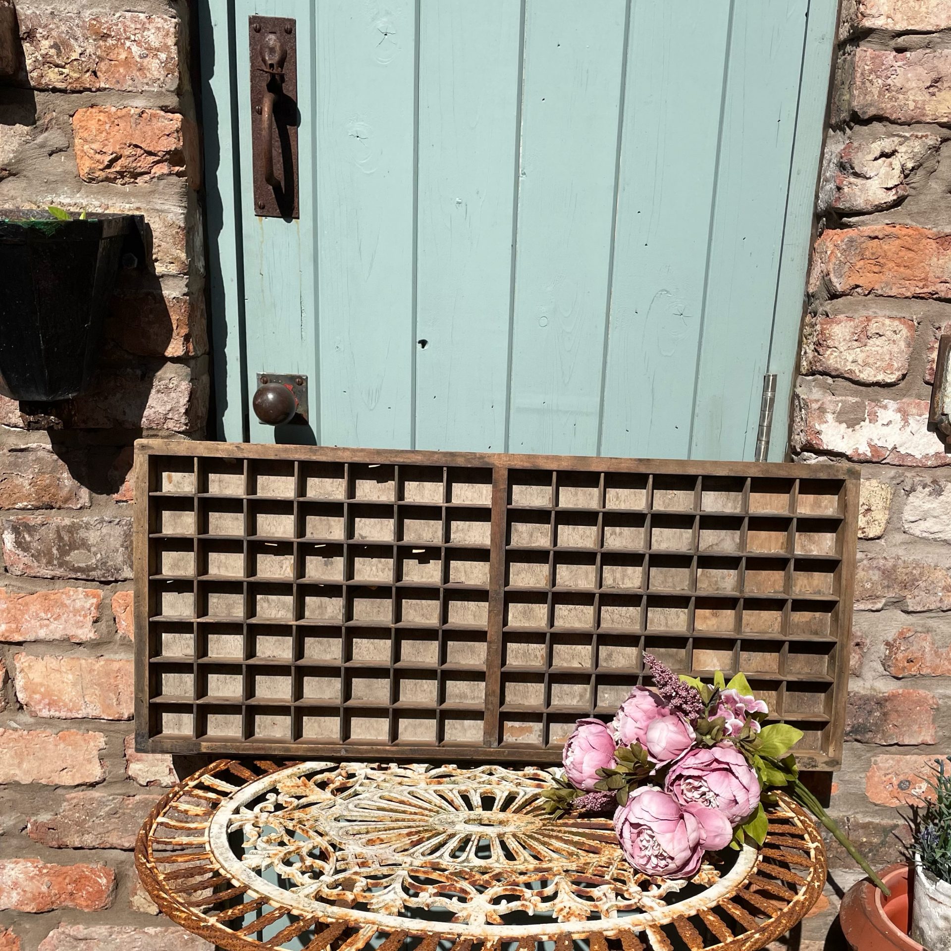 Wonderfully worn old wooden printers drawer. If pristine is your prefernce then this is not for you! Definitely well worn – shabby with lots of vintage charm. A great size, with lots of little compartments and a lovely patina.