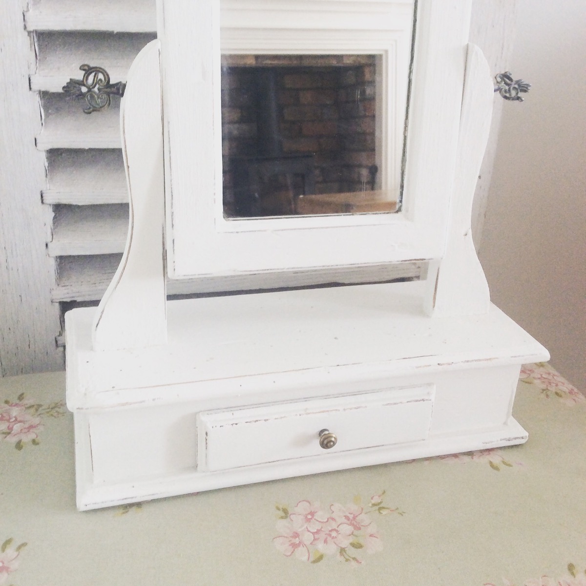This charming shabby chic vintage french boudoir was found in Burgundy and would display beautifully in any little girls room ?? A painted wooden frame which is perfectly strong .. the paint is now distressed with the passage of time as shown. Complete with a little drawer below the mirror, the mirror is intact and has a little foxing. Measures approx 39cm high x 34cm wide x 13cm deep – £45 xx