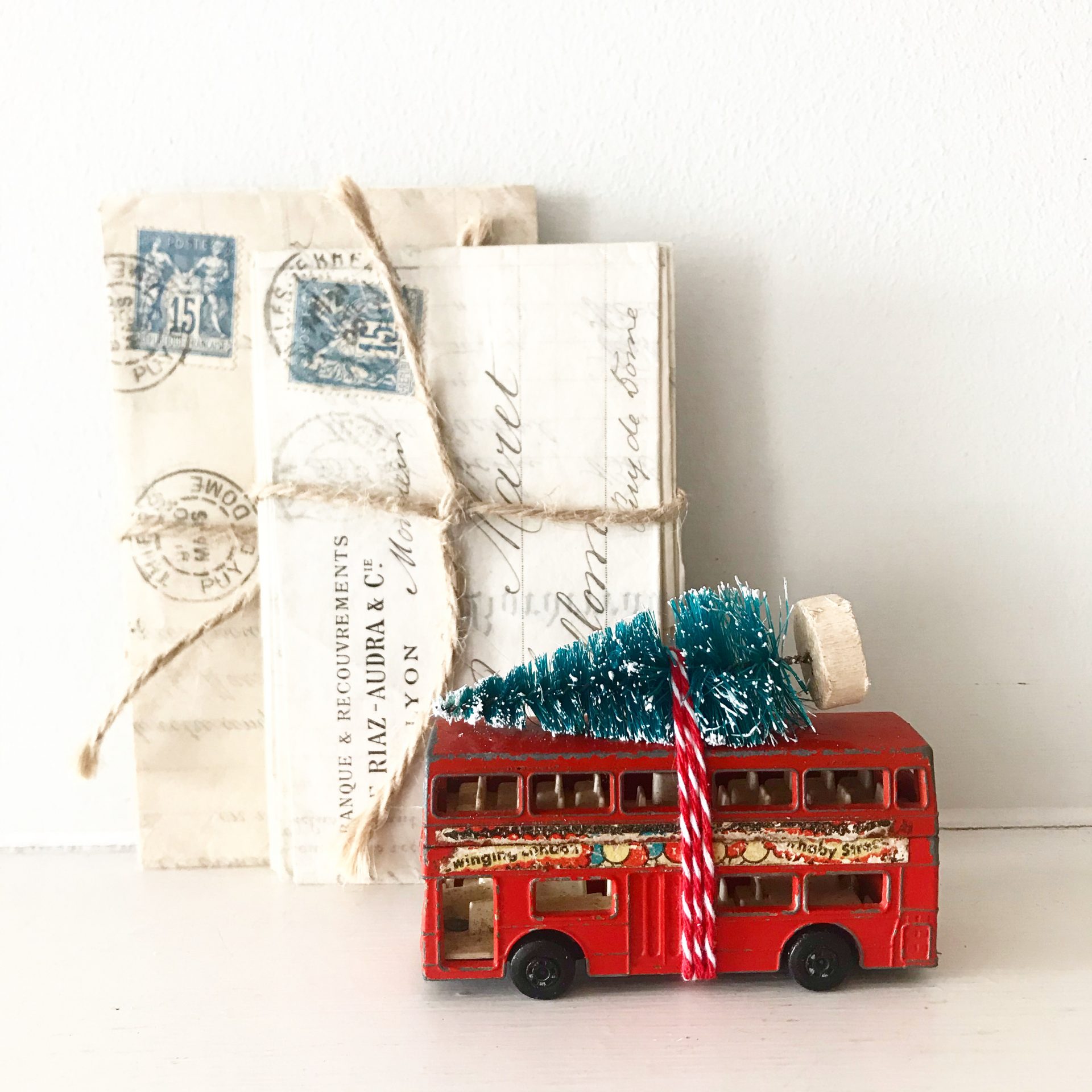 Here we have a charmingly shabby vintage toy bus with little bottle brush tree