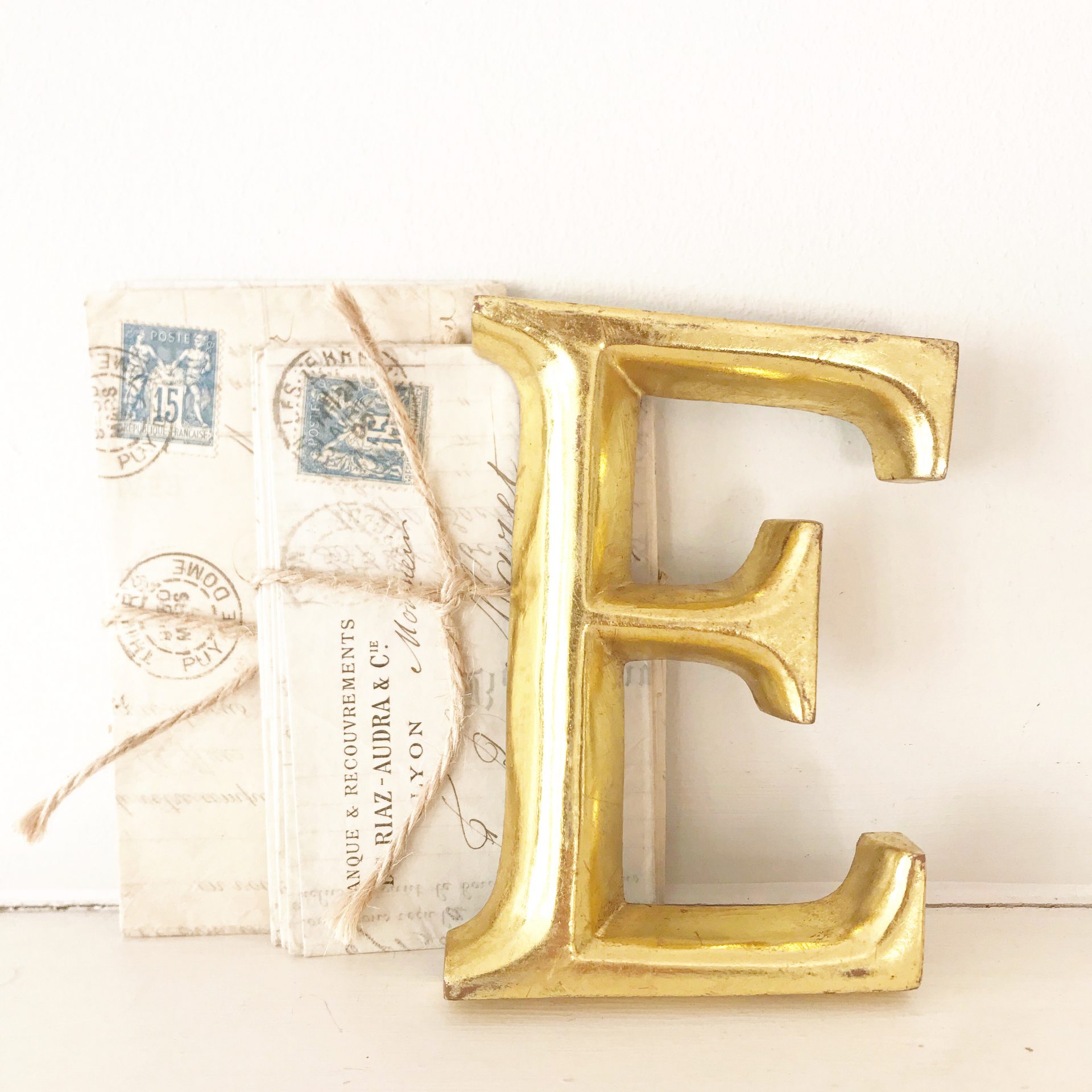 Lovely little gold lightweight wooden letter E (12cm). A lovely little gift idea.