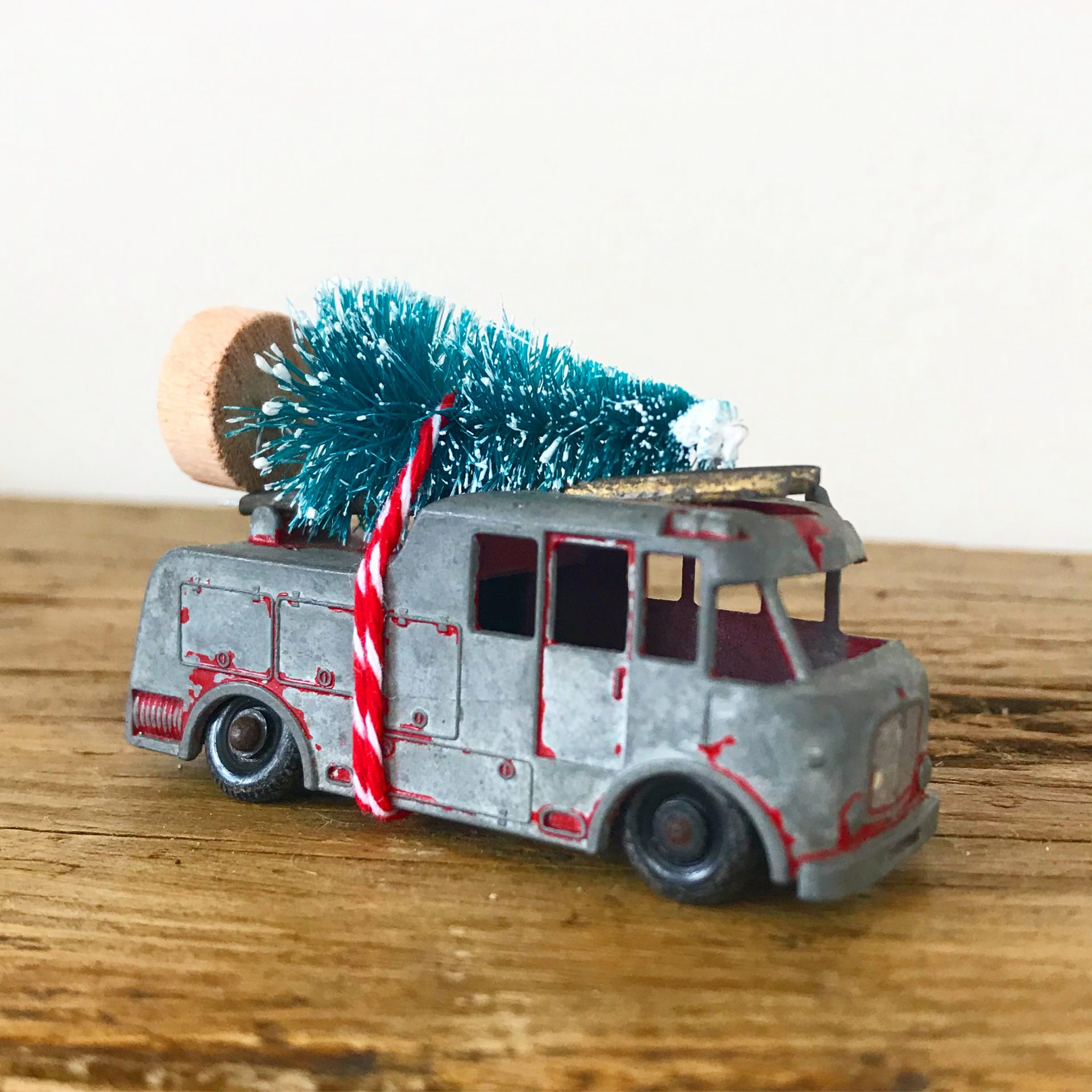 Wonderful little vintage fire engine with bottle brush tree. Almost all the red paint has worn off leaving the original metal showing. Definitely well worn and shabby – just how we like things.